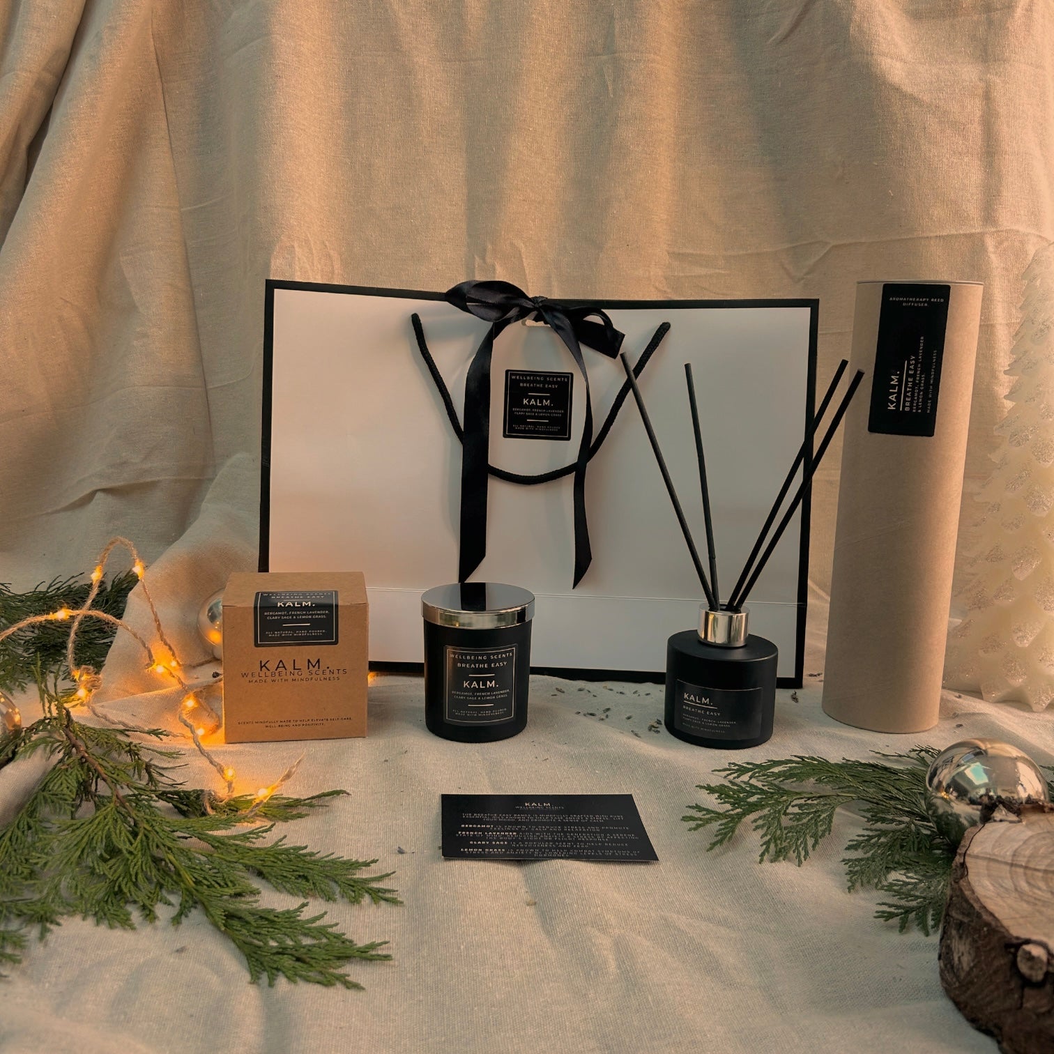 Our Gift Bags are thoughtfully created to bring calm, clarity, and care — the perfect way to share wellbeing in a beautifully mindful way. Each beautifully packaged with our eco-friendly boxes. Our branded gift bag includes a 165g natural candle and 100ml diffuser, complete with a scent description card and positive affirmation, all carefully wrapped in sustainable packaging designed with the planet in mind.